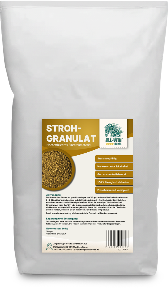 Het effectieve strooiselgranulaat is zeer absorberend en dankzij de thermische behandeling vrijwel kiemvrij, geurneutraliserend en temperatuurregulerend. Het is bovendien 100% biologisch afbreekbaar en ideaal voor biogasinstallaties. Het zorgt voor droge en hygiënische omstandigheden de box en maakt milieuvriendelijke afvoer mogelijk. Geef je paard een schone en frisse stal.