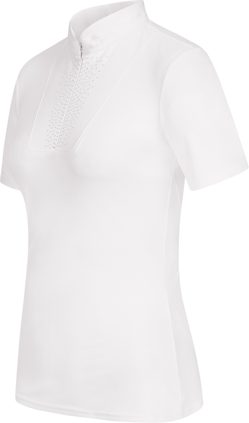Een bijzonder blikvanger is het inzetstuk aan de voorkant, subtiel versierd met decoratieve strass-steentjes, die onder je jasje fonkelende accenten geven. De elegante opstaande kraag sluit comfortabel met een onzichtbare ritssluiting, terwijl de glinsterende E·L·T-logo print op kraag en achterkant het exclusieve design benadrukt. Zo combineer je professionele performance met een vleugje glamour.