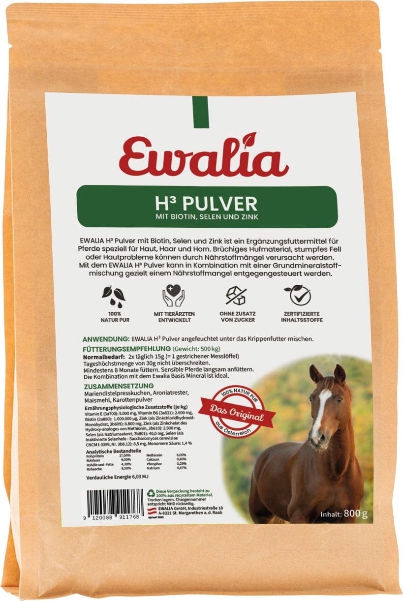 Het H³-poeder is speciaal ontwikkeld om huid, haar en hoorn te ondersteunen. Een tekort aan voedingsstoffen kan resulteren in broos hoefmateriaal, een doffe vacht of huidproblemen. Het H³-poeder voorziet het paard van biotine, selenium en zink en kan in combinatie met een basismineralenmix een voedingstekort tegengaan.