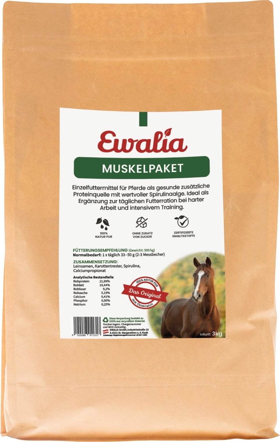 Het spierenpakket van Ewalia is geschikt voor ondersteuning bij de dagelijkse training. Spirulina-algen en lijnzaadpoeder kunnen een positief effect hebben op de natuurlijke spierstofwisseling.