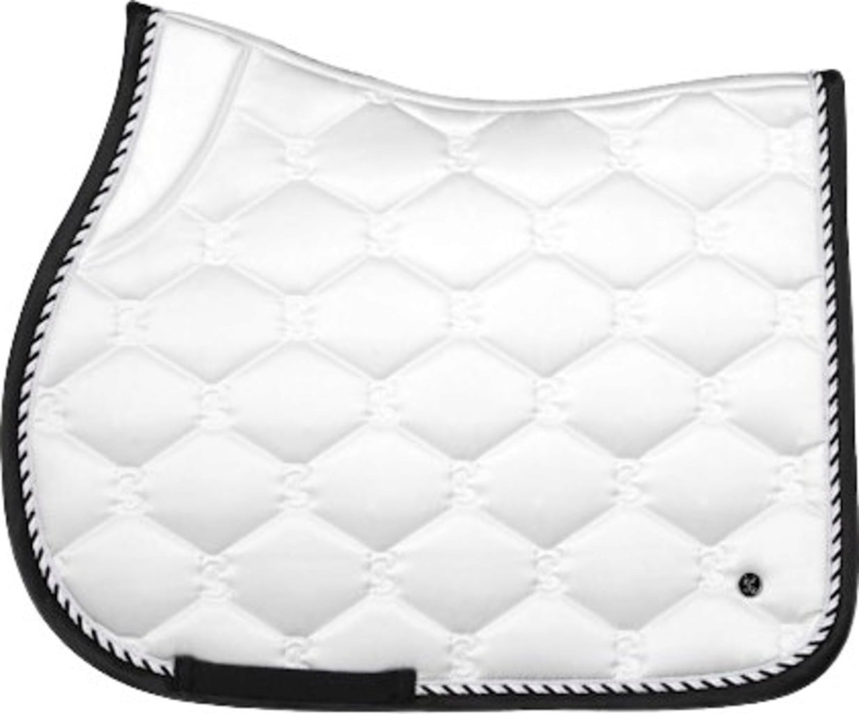 Voor stabiliteit tijdens het rijden zorgen de stopkussens en de middeldikke voering, die wegglijden voorkomen. De hoogwaardige afwerking wordt aangevuld met singellussen met een ingeborduurd merklogo en het decoratieve citaat langs de wervelkolom. Deze zadeldek is daarmee een blikvanger, zowel tijdens de dagelijkse training als op wedstrijden.