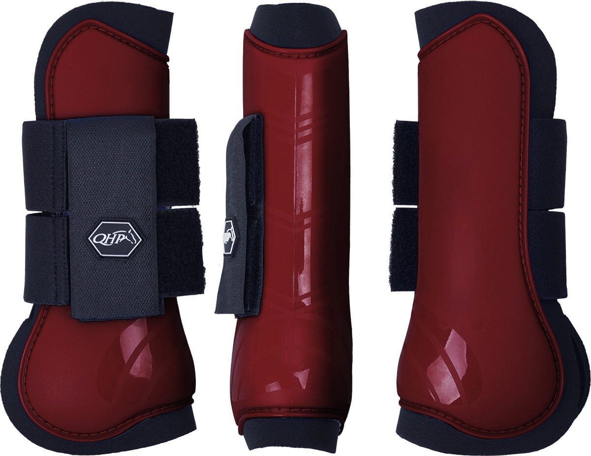 Deze set bestaat uit twee anatomisch gevormde peesbeschermers met een harde schaal in een levendige wijnrode kleur. Ze bieden ideale bescherming voor de benen van je paard tijdens training en wedstrijden.