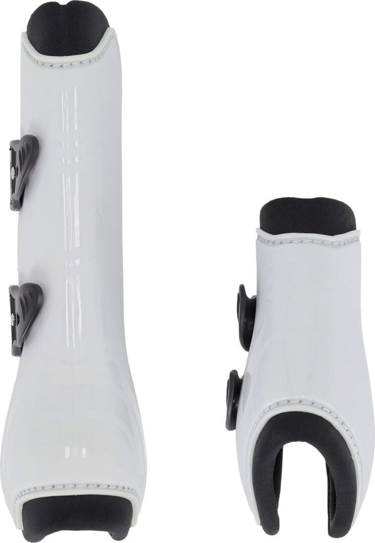 De anatomisch gevormde beschermers zijn gemaakt van een robuust, hard plastic omhulsel (polyurethaan) met een matte afwerking aan de buitenkant, geaccentueerd door glanzende strepen voor een sportieve look. De binnenkant is gevoerd met zacht neopreen voor maximaal comfort. De beschermers zijn ook bijzonder licht en kunnen moeiteloos worden aangetrokken en vastgemaakt in enkele seconden dankzij de elastische snelsluitingen!