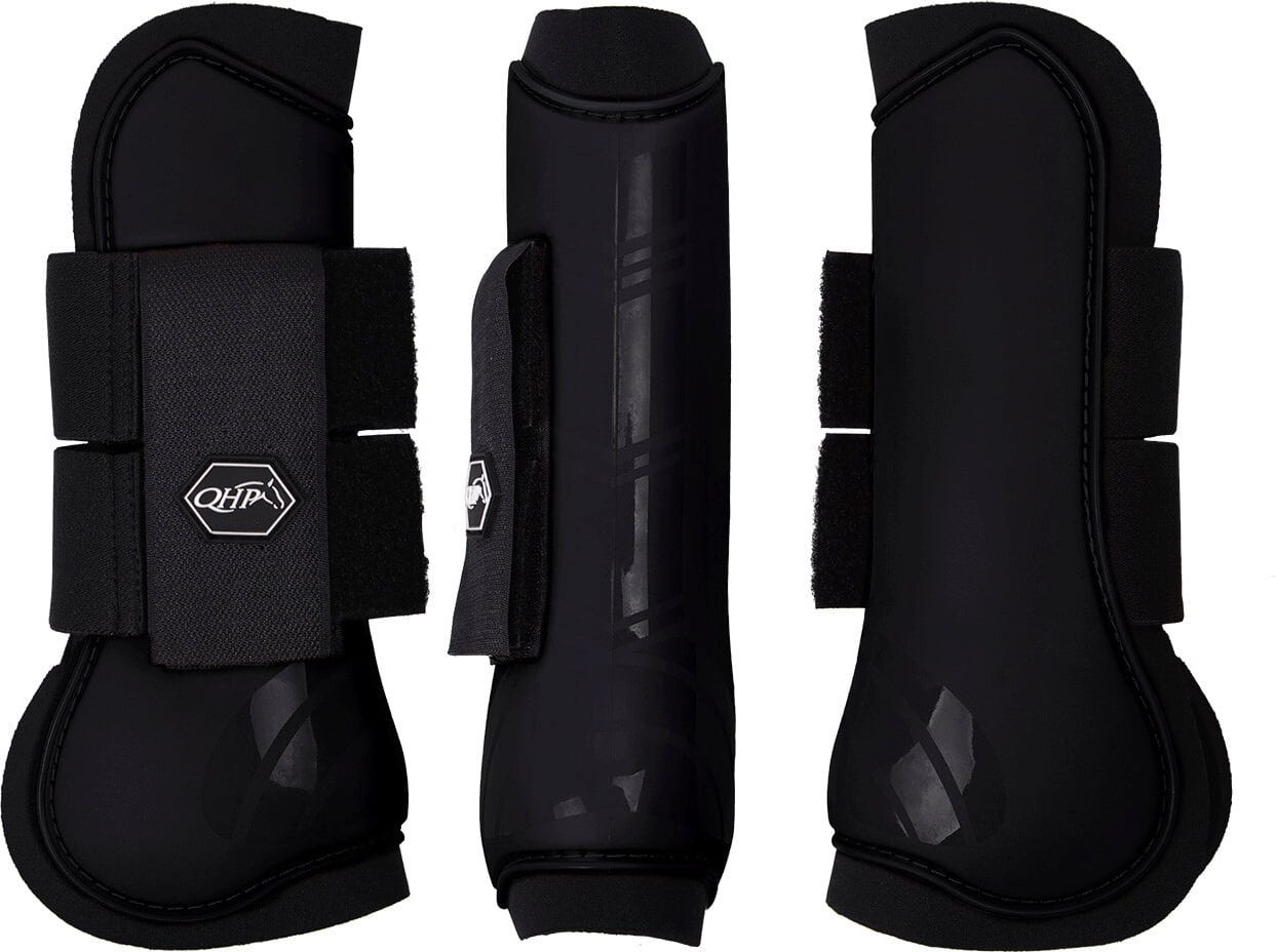 Deze set bestaat uit twee anatomisch gevormde peesbeschermers met een harde schaal in een elegant zwarte kleur. Ze bieden ideale bescherming voor de benen van je paard tijdens training en wedstrijden.