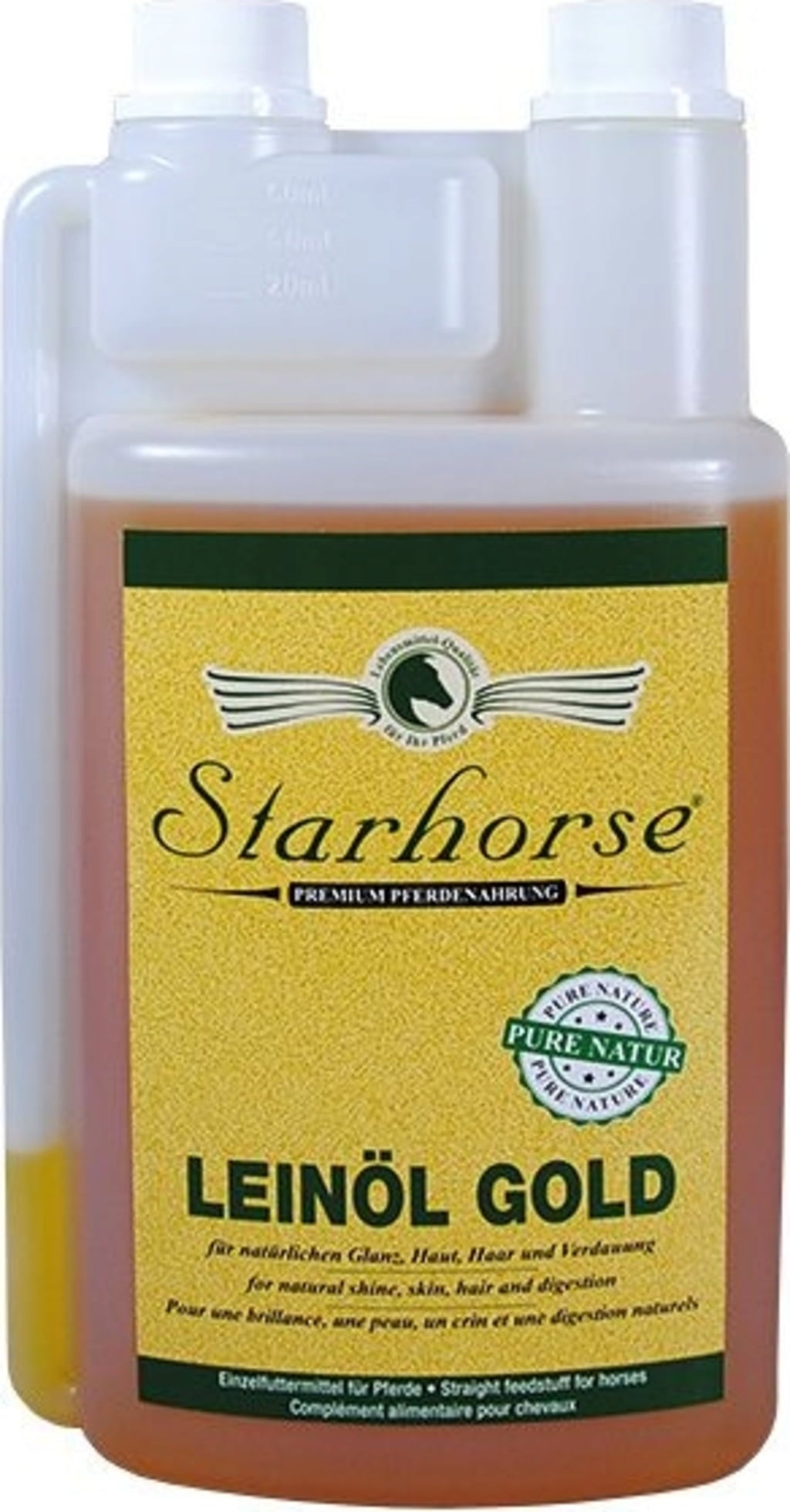 STARHORSE® lijnzaadolie wordt uitsluitend verkregen uit zorgvuldig geselecteerde, zongerijpte lijnzaadvariëteiten. Het ondersteunt de gehele stofwisseling en bevordert de celvernieuwing voor een natuurlijke, langdurige vachtglans. Door het hoge gehalte aan enkelvoudig onverzadigde en meervoudig onverzadigde vetzuren, evenals natuurlijke vitamine E, is STARHORSE® lijnzaadolie ook gemakkelijk op te nemen door het gevoelige spijsverteringsstelsel van het paard. Aangezien STARHORSE® lijnzaadolie geen eiwit bevat, kan het met een iets hogere dosering zonder bijwerkingen een deel van de nutriëntenbehoefte van topsporters dekken. STARHORSE® lijnzaadolie heeft een hoge smerende eigenschap, en ondersteunt zo een optimale voerpassage in maag en darmkanaal.
