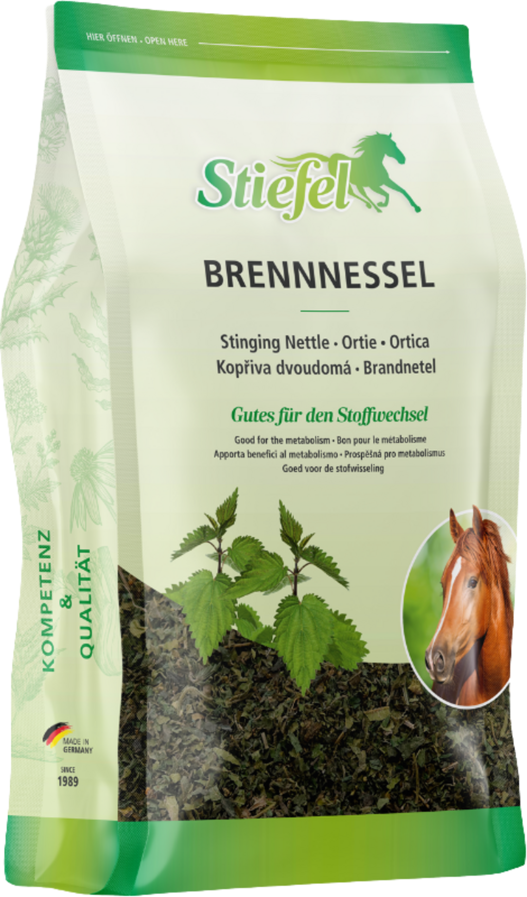 Stiefel-brandnetel kan bij voergerelateerde tekortkomingen een positief effect hebben op de stofwisseling, huid, gewrichten en doorbloeding. Stiefel-brandnetel ondersteunt de nieractiviteit vanwege het hoge kaliumgehalte.