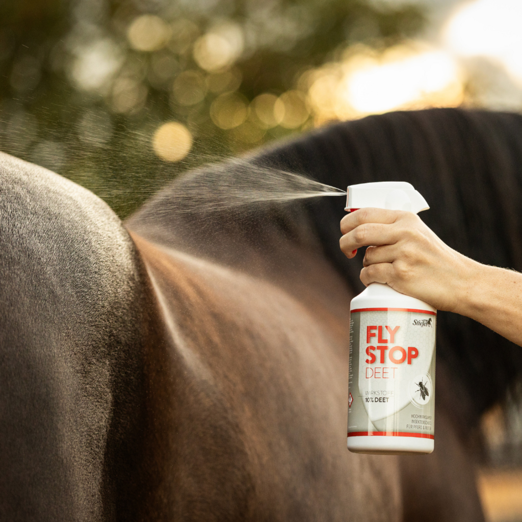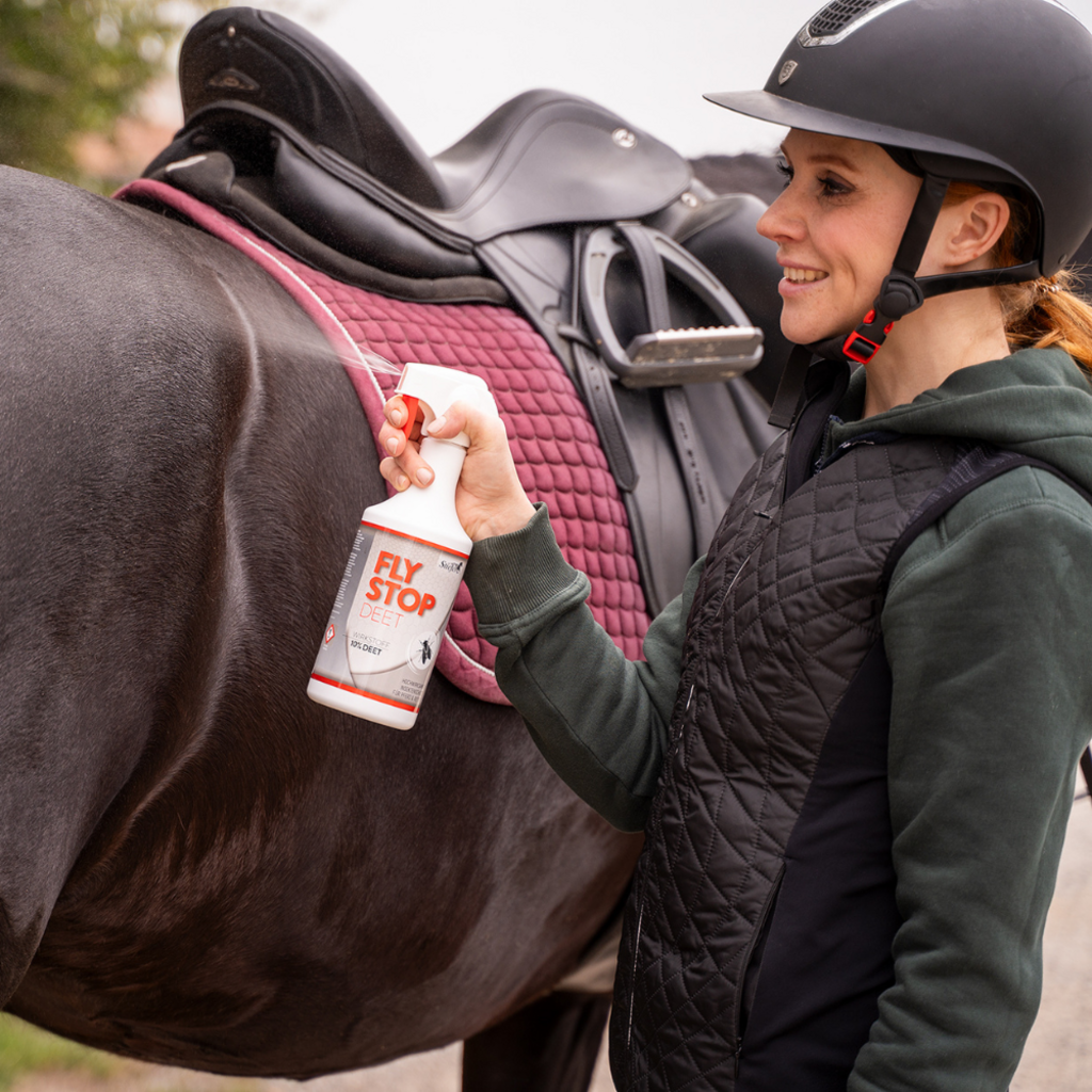 Spray voor een optimale effectiviteit FlyStop over het gehele gebied van het paard. De fijne spuitnevel maakt een gemakkelijke applicatie mogelijk en verdeelt FlyStop in een optimale verhouding. Actieve bescherming vindt onmiddellijk plaats. De werkzame stof DEET is een insectenwerend middel dat een afschrikkende werking heeft op insecten. Wanneer FlyStop op de vacht wordt aangebracht, creëren de vluchtige eigenschappen van het actieve ingrediënt een dunne, beschermende geurwolk die enkele uren kan aanhouden. Geschikt voor paard en ruiter.