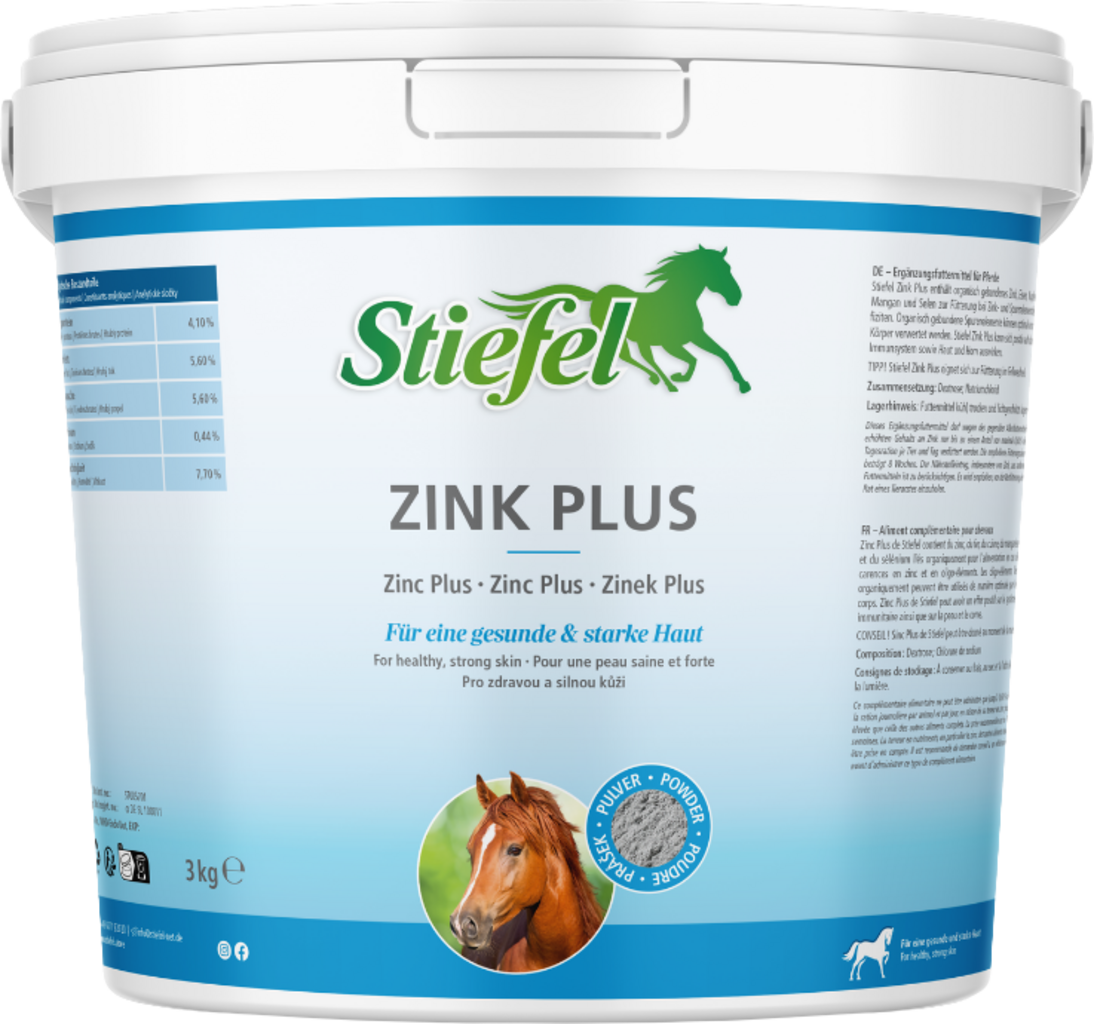 Stiefel Zinc Plus bevat een combinatie van organisch gebonden zink, ijzer, koper, mangaan en selenium om tekorten aan zink en sporenelementen veroorzaakt door voeding te compenseren. De speciale powermix kan een positief effect hebben op het immuunsysteem, de huid en de hoorn van het paard. Zink is een van de essentiële sporenelementen voor de stofwisseling en is een bestanddeel van veel enzymen. Het is ook betrokken bij celgroei en wondgenezing, vooral bij huidproblemen. Zowel het immuunsysteem als veel hormonen hebben zink nodig voor hun functie. Zink kan slechts in beperkte mate in het lichaam worden opgeslagen. Daarnaast is er in veel regio's een zink- en seleniumtekort in de bodem en dus ook in ruwvoer en krachtvoer. Zink moet daarom regelmatig in voldoende hoeveelheden worden gevoerd.