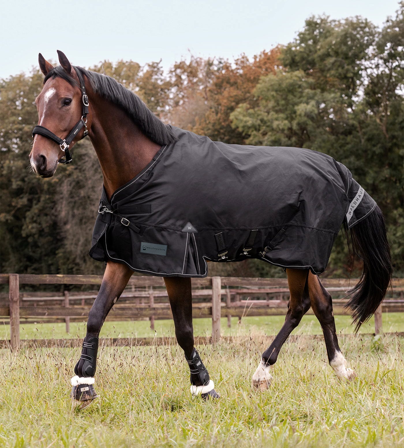 De pasvorm is doordacht: de praktische V-frontsluiting garandeert een stabiele ligging en voorkomt samen met de drie singels ongewenst verschuiven. Dankzij de royale loopplooien blijft de bewegingsvrijheid altijd optimaal. Voor nóg meer flexibiliteit in de winter is de deken voorzien van bevestigingslussen – zo kun je eenvoudig een los verkrijgbaar halsdeel aanbrengen. De extra grote staartflap biedt extra bescherming, terwijl de reflecterende bies zorgt voor goede zichtbaarheid in de schemering.